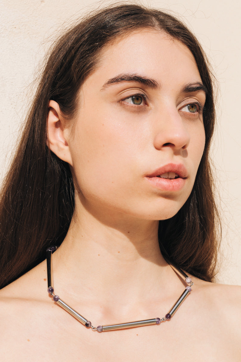 This piece is superb whether you want to give your look an elegant finish, to highlight your everyday outfit like jeans and a simple tee or an elegant evening ensemble. It was inspired by constellations and the invisible connections between them. It is all so mysterious and so will you be no matter how you choose to combine this work of art with your favorite wardrobe pieces. Hidden Lines necklace features galvanized hand cut brass and amethyst.