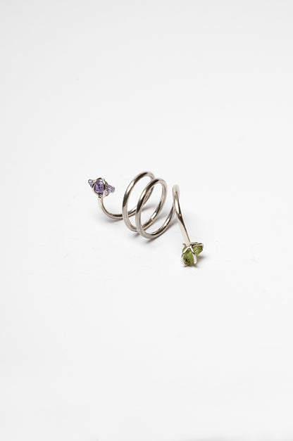 Handcrafted from solid sterling silver and raw amethyst and peridot carefully set in prong setting.